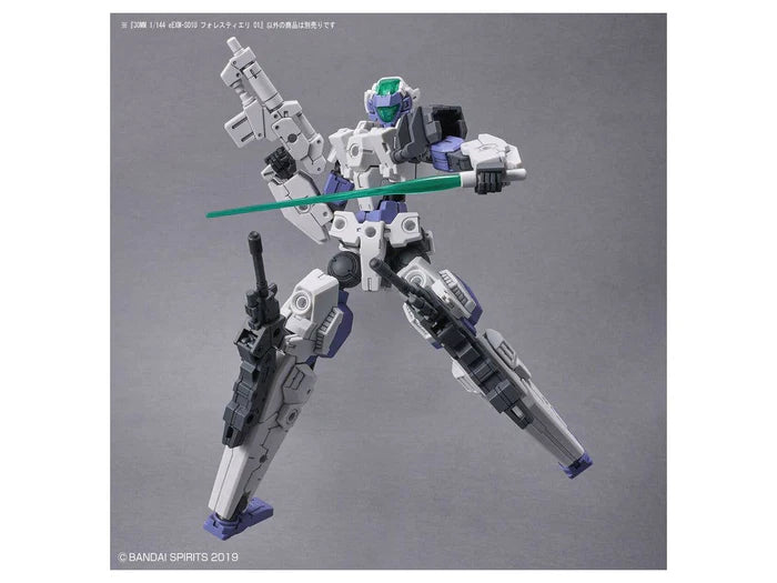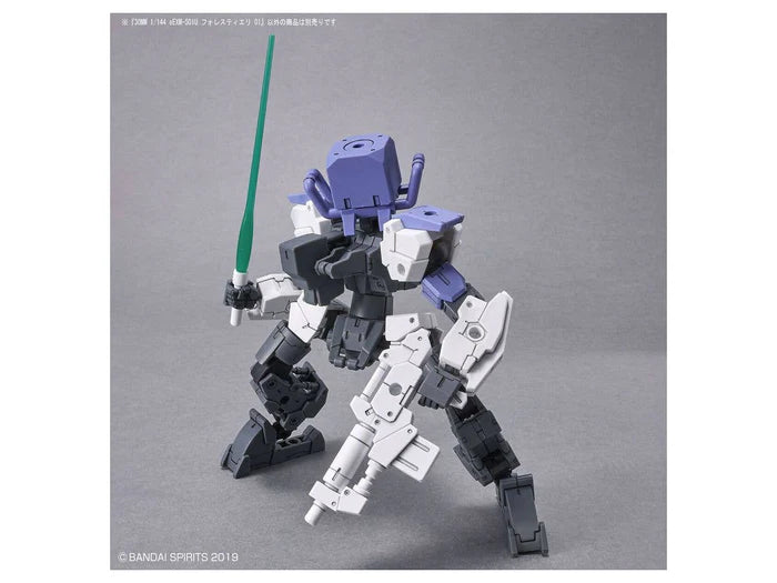 Introducing the eEXM-S01U Forestieri 01, the latest addition to the "30MM" (30Minutes Missions) model-kit series by Bandai! This innovative fighting mech is designed for easy assembly with its intuitive "block" assembly system, allowing you to quickly identify and assemble the necessary parts. Enhance your collection with the included new weapon, the Roy Roy, along with its rifle and beam sword. For added versatility, the beam sword's hilt and the rifle can be conveniently attached to the backpack, and the beam sword’s hilt can also be secured to the thigh. Thanks to common 3mm joints, this model is fully customizable, enabling you to mix and match parts with other items in the 30MM series for a truly unique build. Make the eEXM-S01U Forestieri 01 yours today! [Includes]: • Rifle • Beam sword • Roy Roy • Hand parts (x1 set)