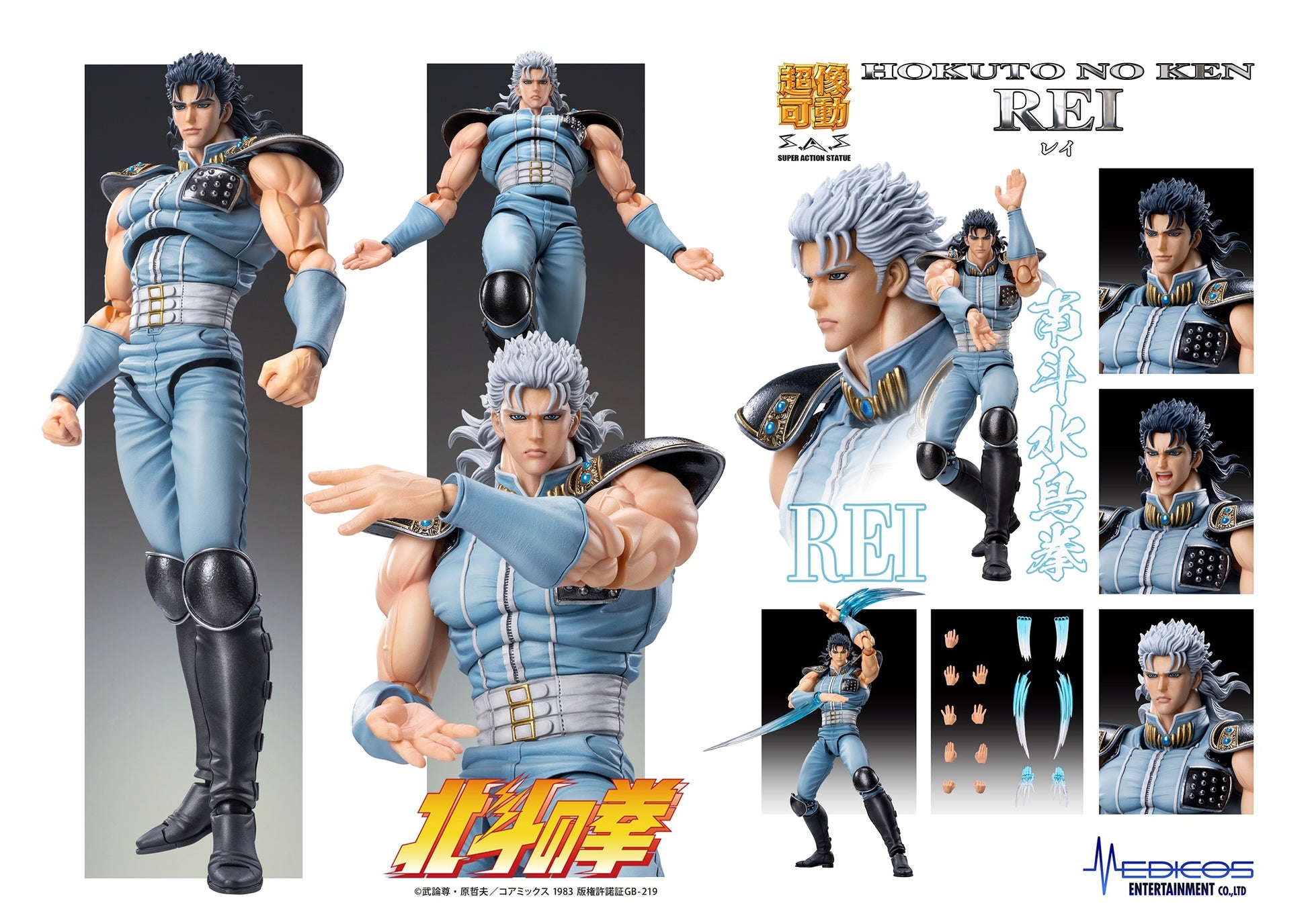 From Medicos. Rei from Fist of the North Star gets a new Super Action figure from Medicos! This supremely posable figure comes with interchangeable heads and hands, as well as effect parts inspired by "Hokuto Hyakureken," and other parts too! A stand for display is included, with a jointed arm for airborne poses. Order this iconic character for your own collection today!