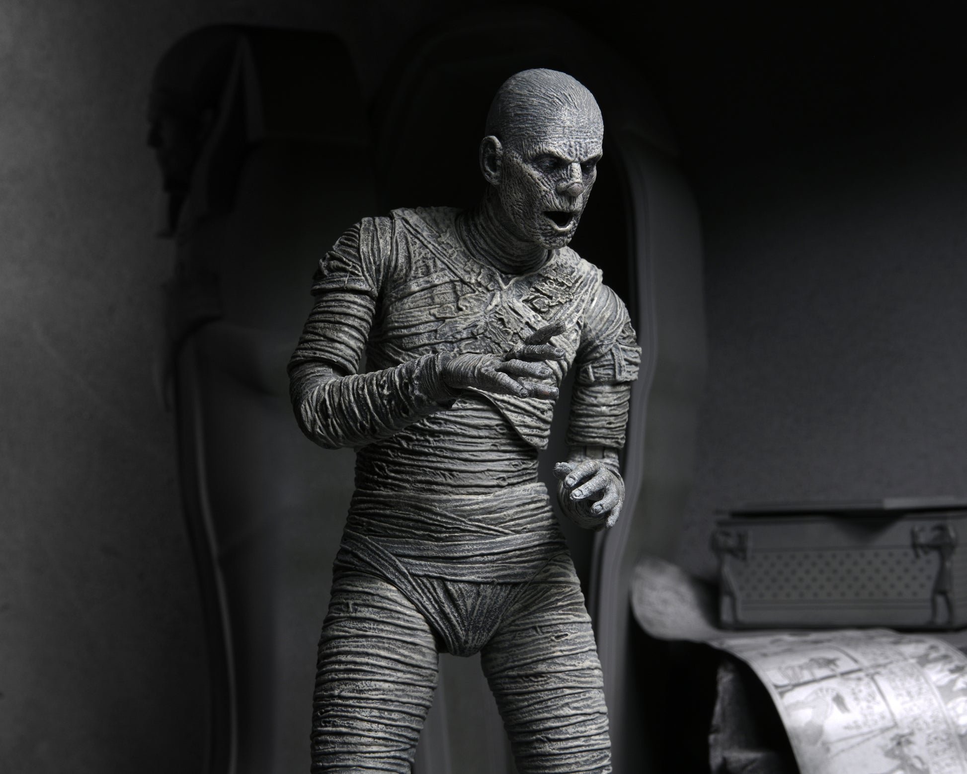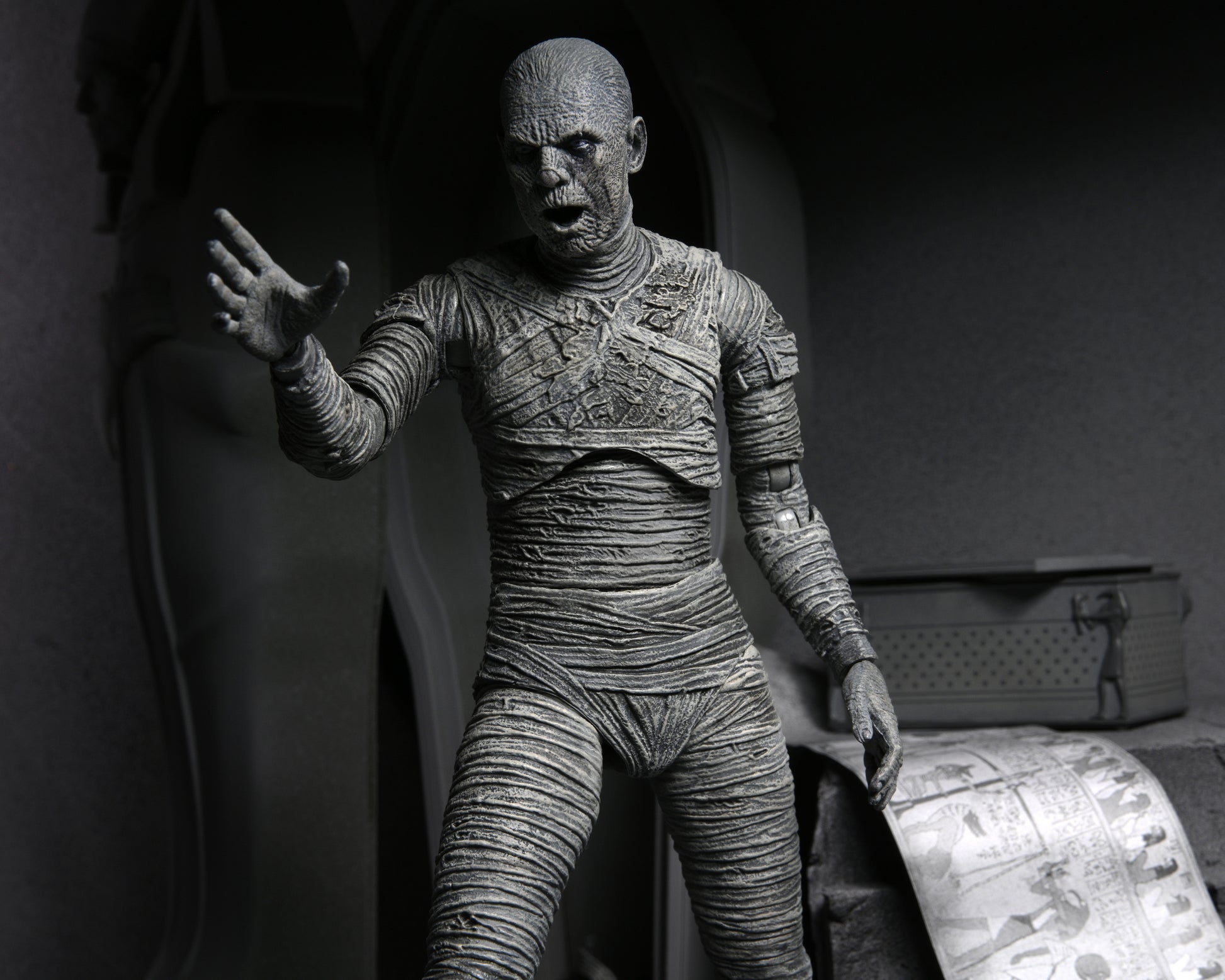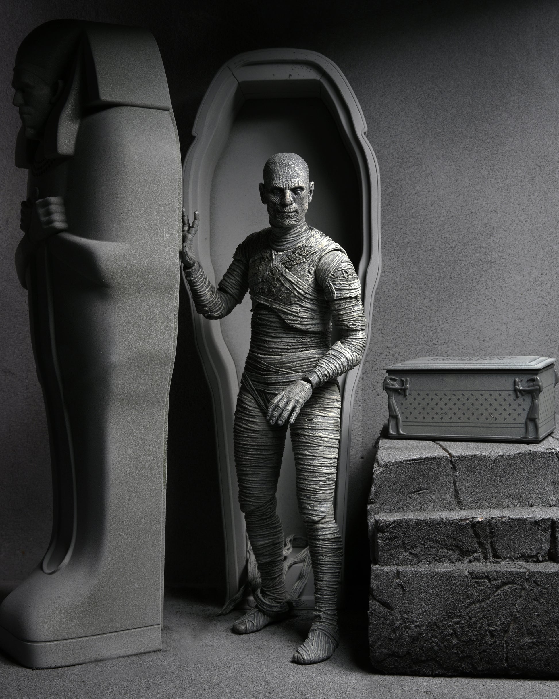 For the 90th anniversary of the extraordinary silver-screen classic, NECA presents The Mummy action figure in authentic black-and-white! In this Universal Monsters classic of horror, Boris Karloff shines as the ancient Mummy in a tale of love transcending death. The sculpt captures the intricate special effects makeup that required eight hours to apply and two hours to remove. Standing in 7” scale, the figure comes in premium packaging with interchangeable heads, interchangeable hands, and Egyptian chest that opens.